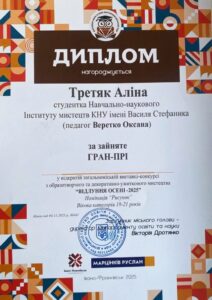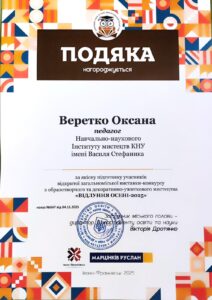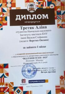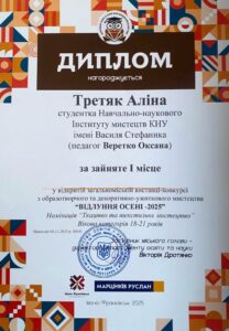 1 листопада 2025 року студенти кафедри методики викладання образотворчого і декоративно-прикладного мистецтва та дизайну взяли участь у відкритій загальноміській виставці-конкурсі з образотворчого та декоративно-ужиткового мистецтва «Відлуння осені – 2025», організованій міським центром дитячої та юнацької творчості Івано-Франківської міської ради. За підсумками конкурсу студентам вдалось досягнути наступних результатів: