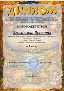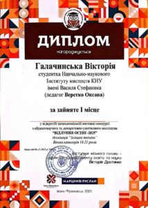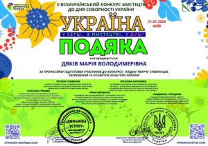 Творчі здобутки студенток кафедри методики викладання образотворчого і декоративно-прикладного мистецтва та дизайну Хмелівської Вікторії Романівни та Хмелівської Вероніки Романівни були відзначені дипломами (перше місце та гран-прі) ІІ Всеукраїнського конкурсу до дня соборності України “Україна у серці, в мистецтві, в душі” громадської організації «Динаміка успіху», який відбувся 21 січня 2026 р. в м. Києві. Під керівництвом старшого викладача Оксани Веретко, доцента Марії Дяків та викладача Галини Коман студентками було виконано творчі роботи в категоріях декоративно-прикладного та образотворчого мистецтва. Відзнаки та подяки засвідчили високий рівень художньої підготовки здобувачів освіти спеціальності А4.12 Середня освіта (Образотворче мистецтво).