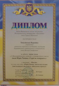 Творчі роботи студенток кафедри методики викладання образотворчого і декоративно-прикладного мистецтва та дизайну Хмелівської Вікторії Романівни та Хмелівської Вероніки Романівни належно оцінені журі ІІ Всеукраїнського конкурсу з міжнародною участю імені Юрія Чопика “Герої не вмирають”. За тематичні композиції створені Вікторією та Веронікою під керівництвом викладачів кафедри, нагороджено ІІ призовими місцями. Глибокі відчуття війни, що триває, втілені студентками в колористичних зображеннях, де відчутна емоційна рефлексія юних талановитих особистостей. Урочисте вручення дипломів та грамот відбулось в Івано-Франківській обласній філармонії за участю Світлани Василівни Онищук Голови Івано-Франківської обласної державної адміністрації та за сприяння Івано-Франківського міського об’єднання Всеукраїнського товариства “Просвіта” ім. Т.Шевченка. Присутні високо оцінили досягнення молоді, яка навіть попри реалії сьогодення не перестає творчого розвиватись.